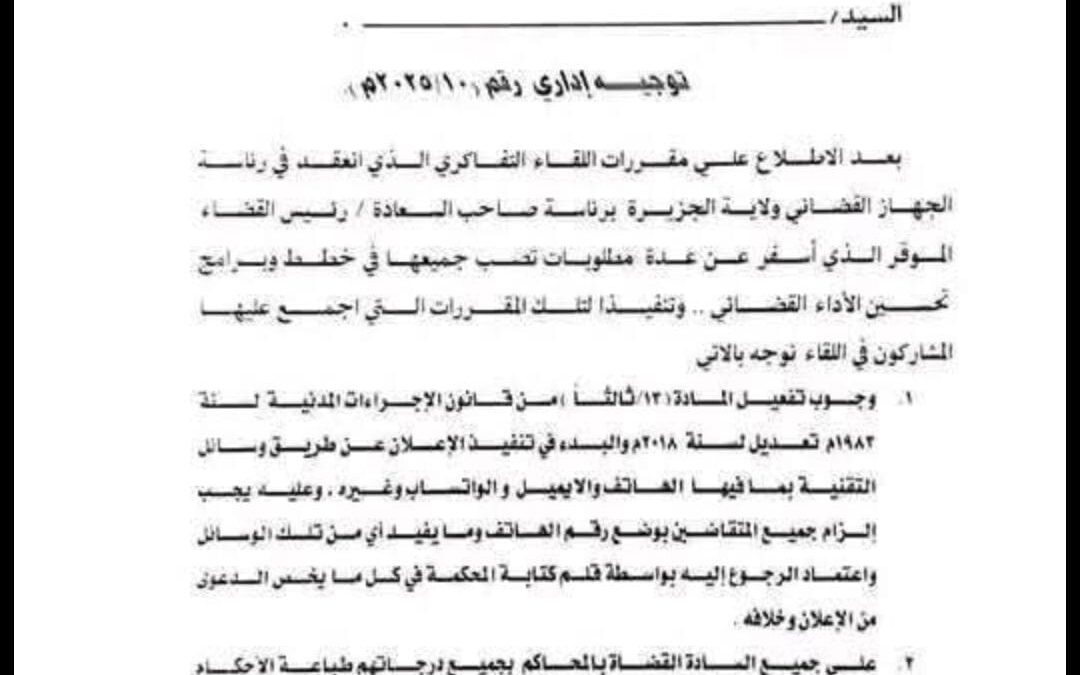 اعتمد القضاء السوداني الإعلان عبر الهاتف والبريد الإلكتروني وتطبيق واتساب كطرق رسمية لإخطار المدعى عليهم، وذلك تنفيذًا للتوجيه الإداري رقم (10) لسنة 2025.