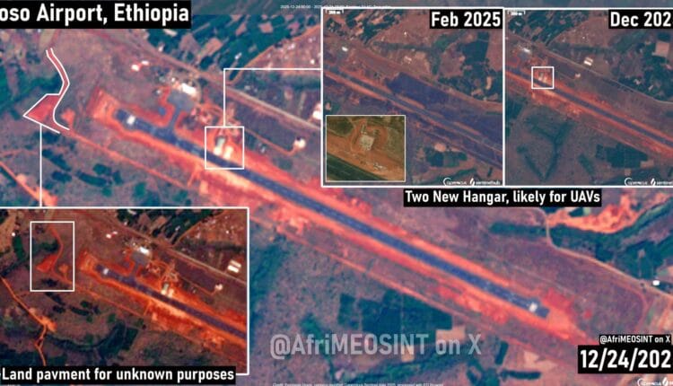 أظهرت صورة الأقمار الاصطناعية، أول دليل مرئي على نشاط عسكري في حدود إثيوبيا مع السودان، عبارة عن بناء حظيرتي طائرات جديدتين في مطار “أصوصا” عاصمة إقليم “بني شنقول- قمز” بالقرب من الحدود السودانية، ورجحت مصادر أن أنهما مخصصتان لاستيعاب الطائرات المسيرة المقاتلة (UCAVs) كما تجري حاليًا أعمال إنشائية إضافية في الموقع، تشمل تحسينات وتجهيزات للأرضية.