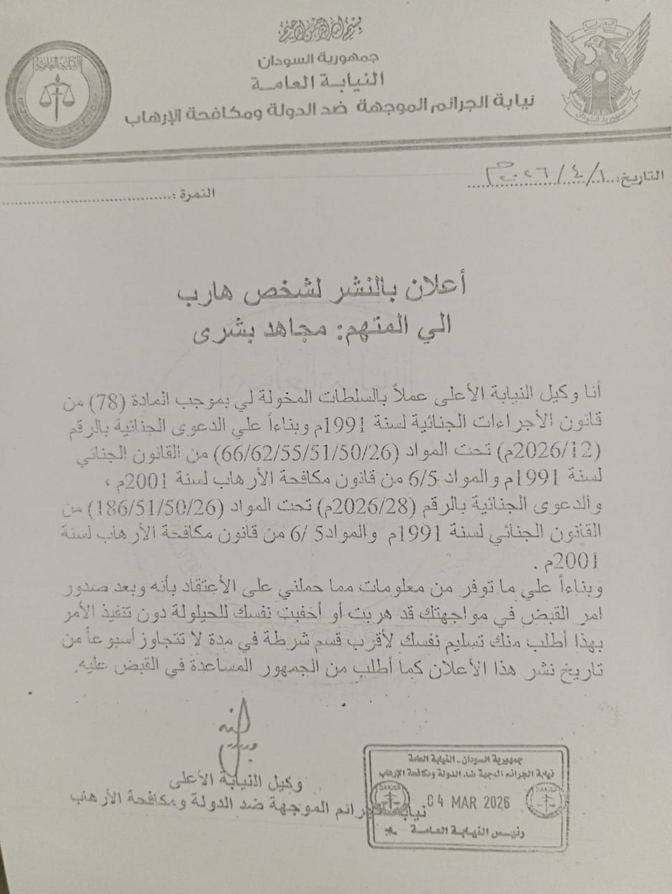 طالبت نيابة الجرائم الموجّهة ضد الدولة ومكافحة الإرهاب المتهم مجاهد بشري بتسليم نفسه خلال أسبوع من تاريخ نشر إعلان رسمي صادر عنها في 4 مارس 2026، استناداً إلى المادة (78) من قانون الإجراءات الجنائية لسنة 1991.